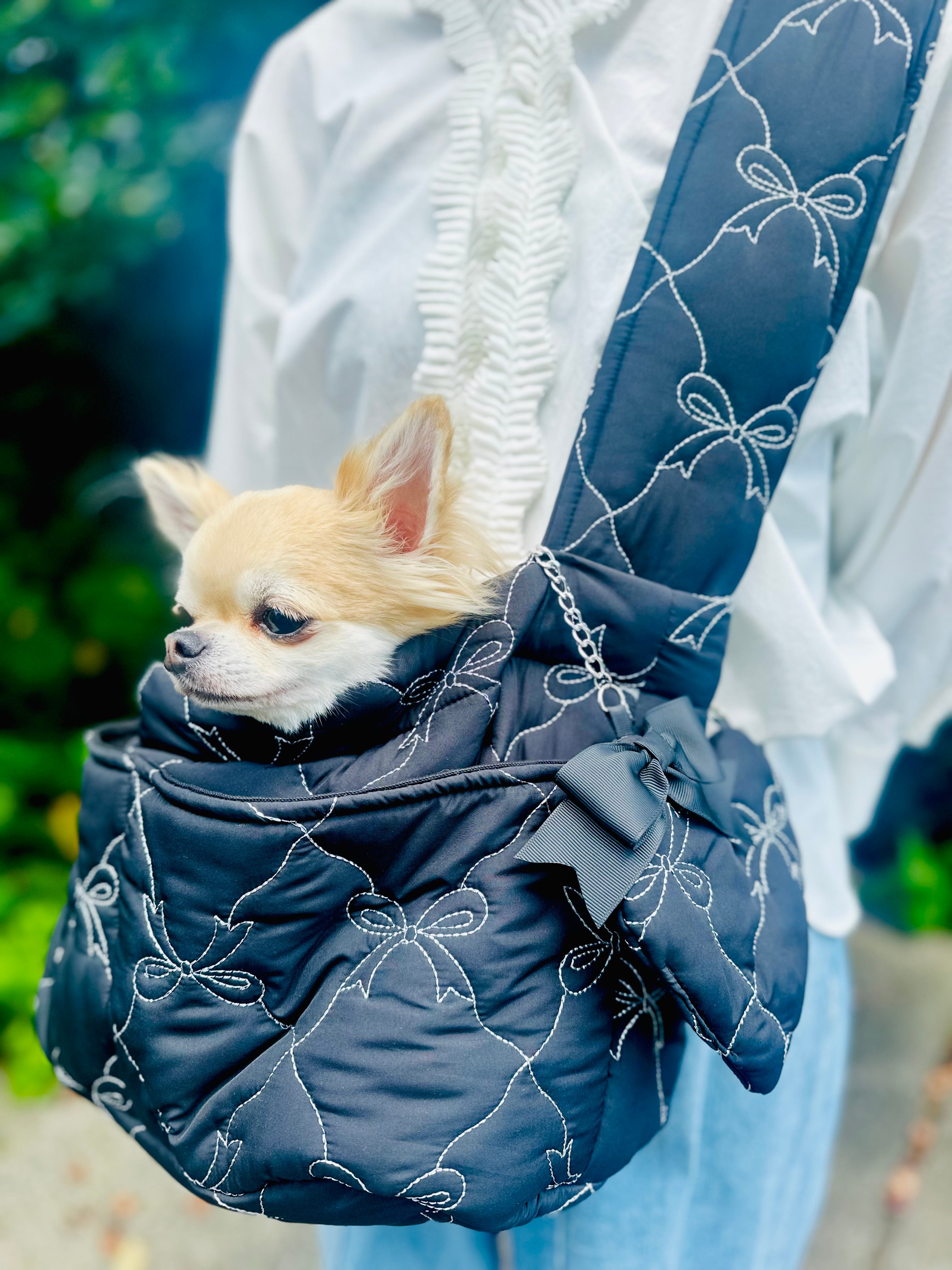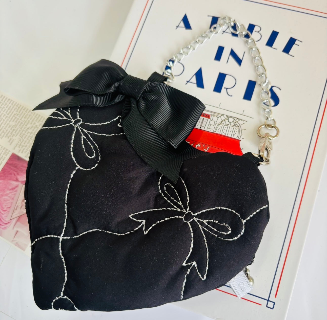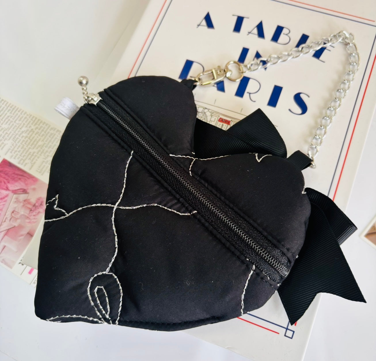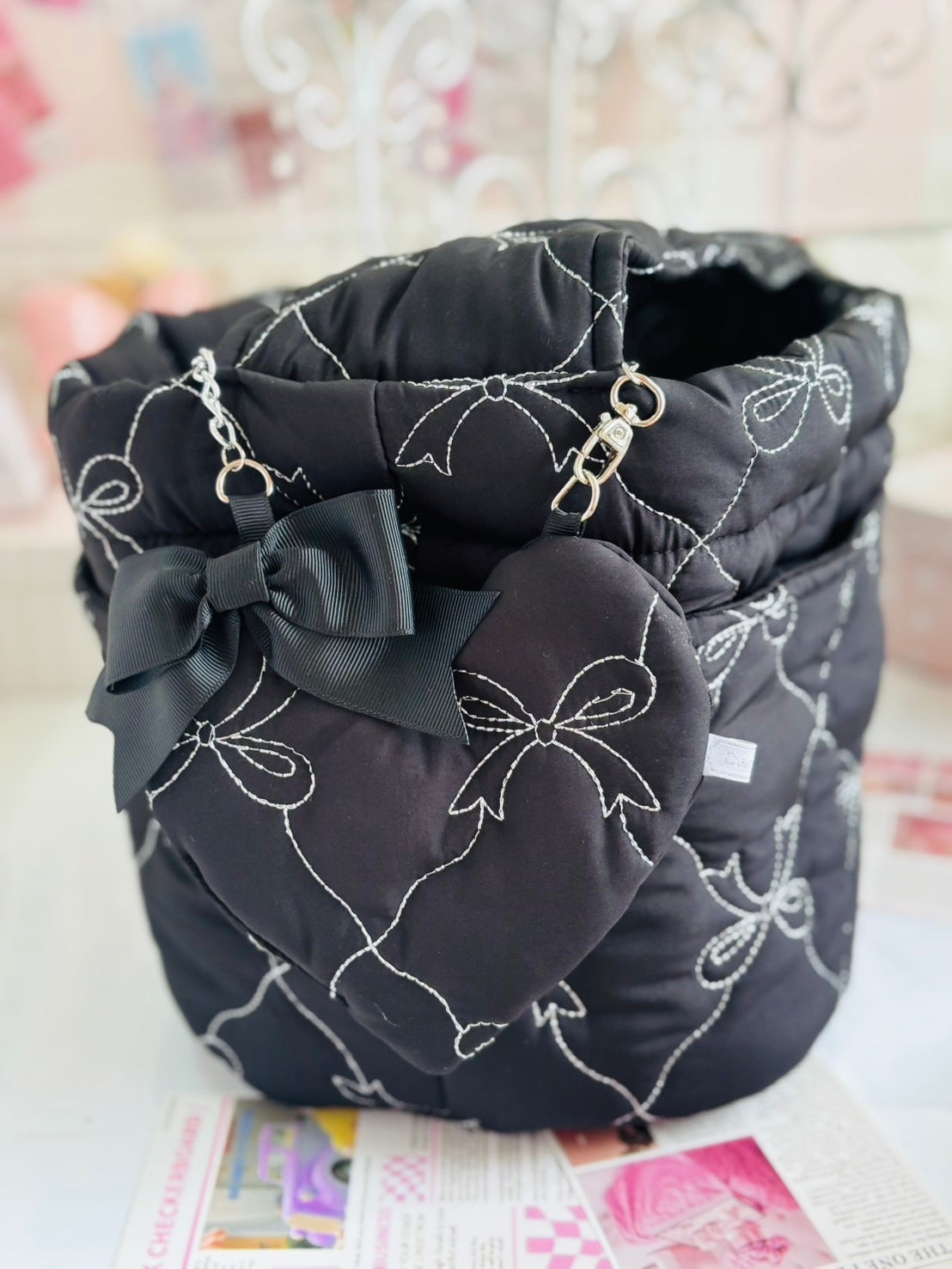 しっかり目のキルティング素材にシルバーのリボンのステッチが大人可愛い