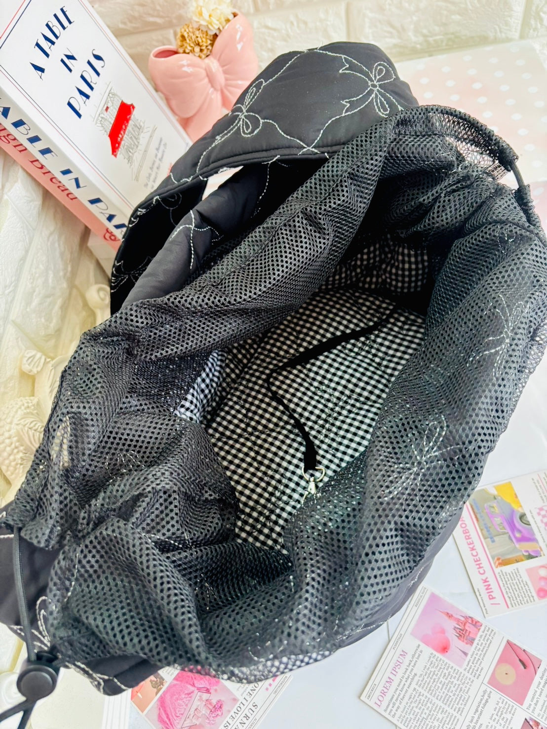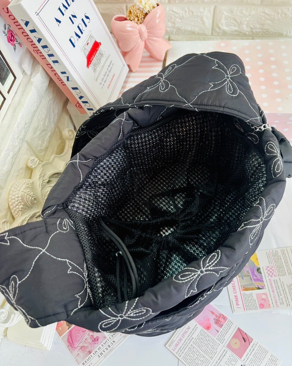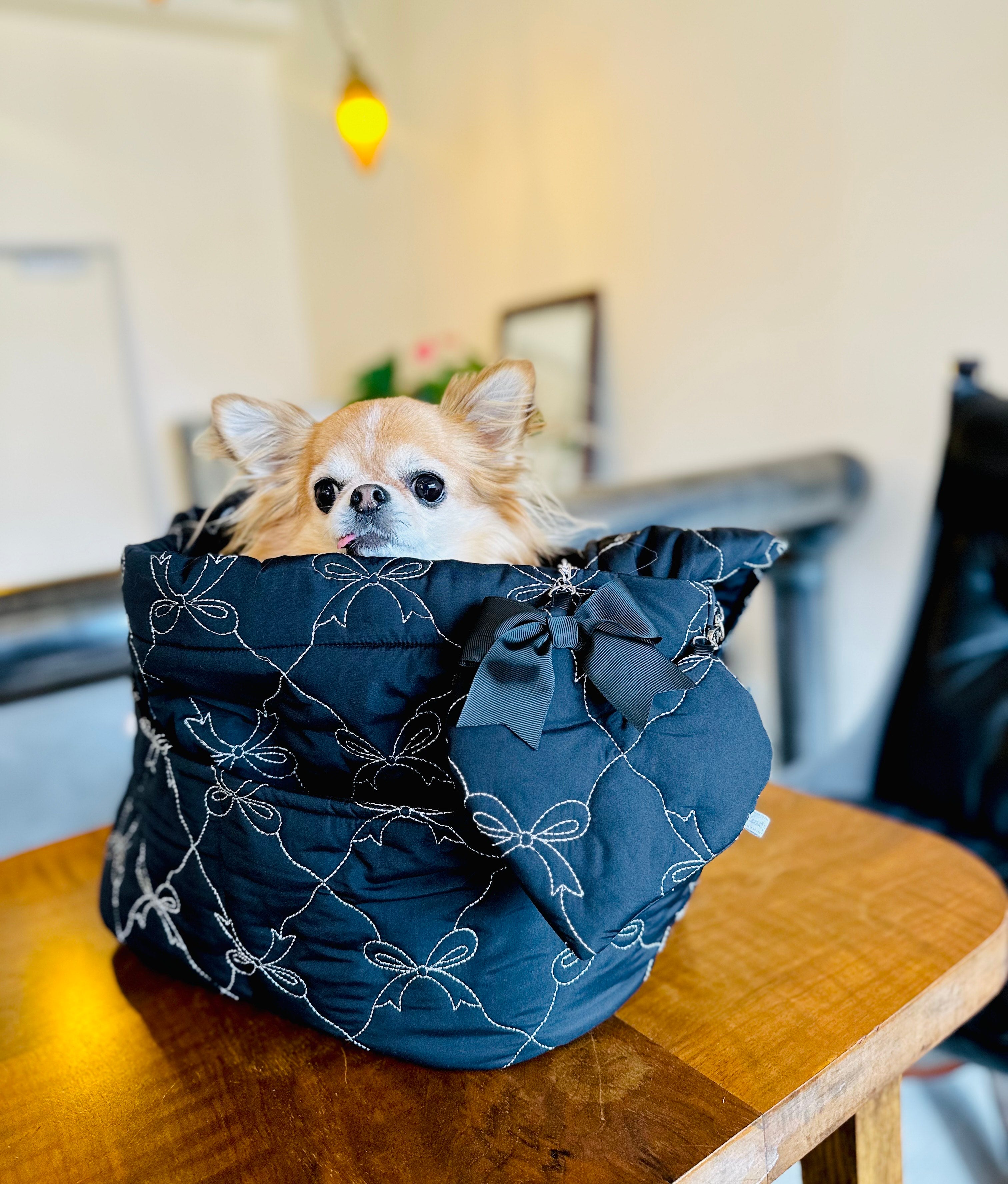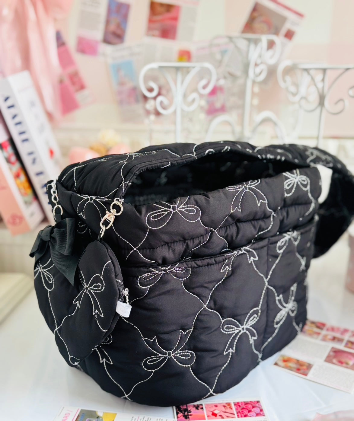 しっかり目のキルティング素材にシルバーのリボンのステッチが大人可愛い